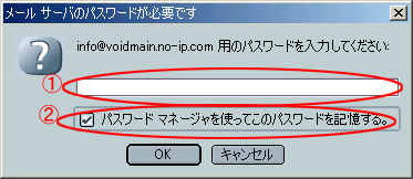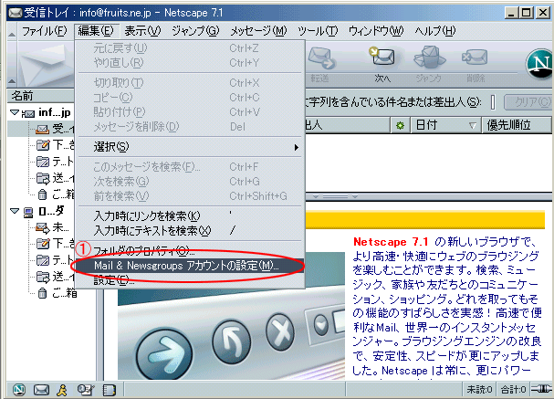 Netscape Mail&Newsgroupを起動します メニューバーの「編集」をクリックし、「Mail&Newsgroupアカウントの設定」をクリックしてください ![]() 1.「送信サーバ(SMTP)」を選びます(クリック)。 2.「サーバ名」に「 smtp.fruits.jp 」と入力します。 3.「名前とパスワードを使用する」にチェックします。 4.「ユーザ名」にご自分のメールアカウントを入力します。 ※OP25B対応 OP25Bを導入しているプロバイダ回線から弊社のメール送信認証を使用する場合は、「ポート」欄に「587」と入力して下さい。 ![]() 事前設定は以上で終わりです。 「OK」ボタンをクリックして画面を閉じます。 実際にメールを送信する際に上記画面が表示され、パスワードの入力を求められるようになります。 1.パスワードにはメール受信時のパスワードと同じパスワードを入力します。 2.パスワードを記憶しておくと次回送信の際にパスワードを入力する手間が省けます。 ![]() パスワードが正しく入力されていればメール送信が完了します。 |