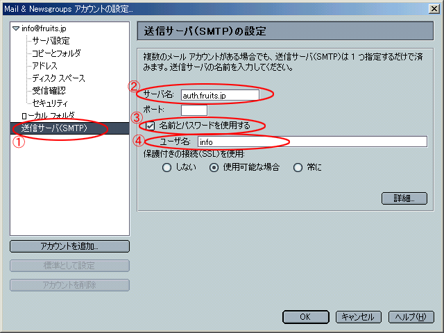 メニューバーの「ツール」をクリックし、「アカウント設定」をクリックしてください ![]() 1.「送信サーバ(SMTP)」を選びます(クリック)。 2. 編集するサーバに「smtp.fruits.jp」を選択します。 3.「編集」をクリックしてください ![]() 1.「ユーザ名とパスワードを使用する」にチェックします。ユーザ名にはメールアカウントを入力してください。 2.ポート番号を587番に変更します。 ![]() パスワードは、メール送信時に問い合わせがありますので、受信パスワードと同じものを入力してください。 |